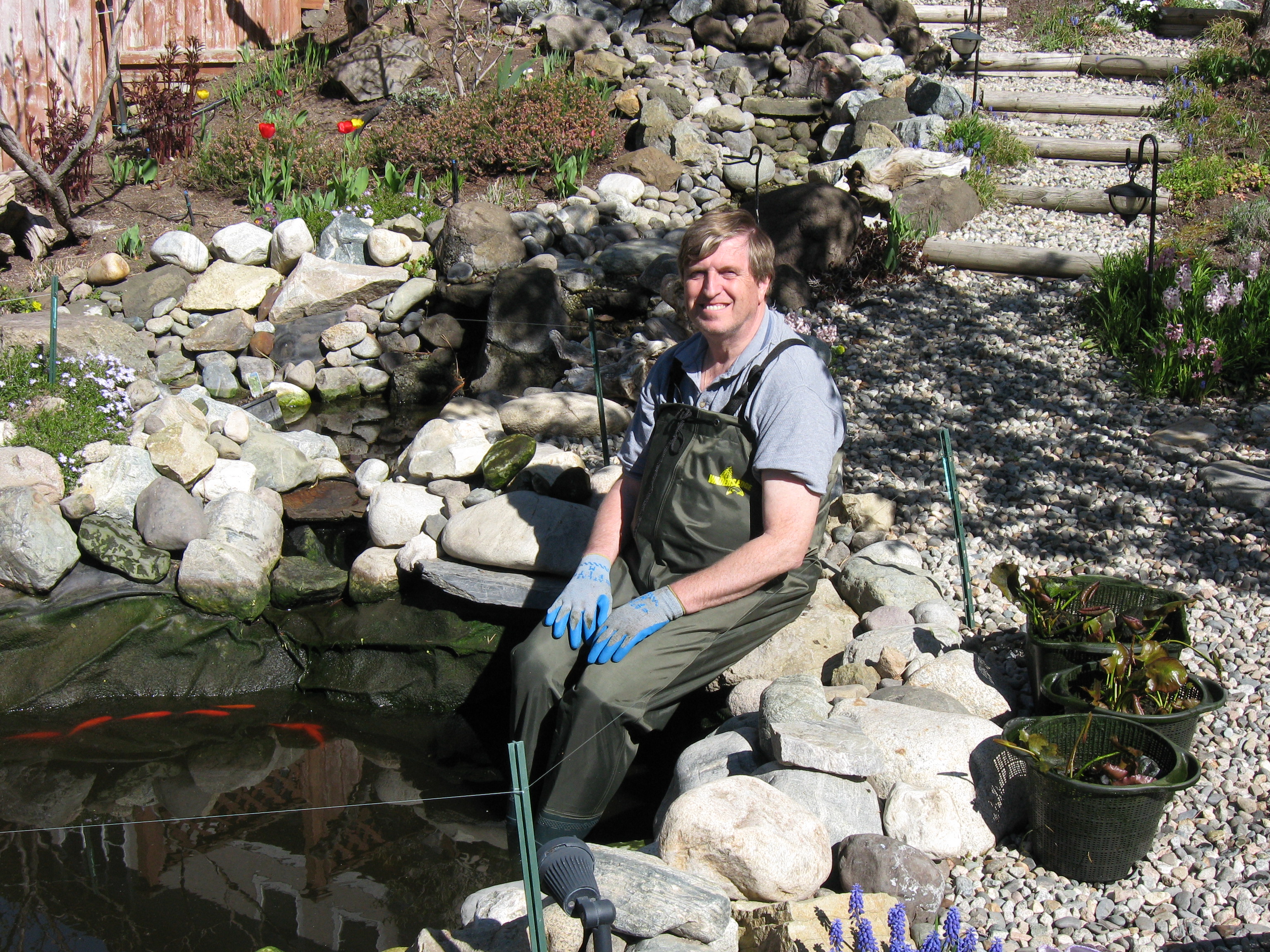 Unfortunately, it takes some real labour to maintain that restful retreat. And those same friends are never around to help with the algae or the muck. But I do get to see ol’ Hubby in those green chest-waders – and that’s one of the perks. He looks like an over-grown little boy in his own fishing hole, Tom Sawyer style, with a curious smile, minus the fishing pole, and having way, way, bigger feet. Getting someone else to tackle that pond clean-up just wouldn’t be the same.