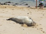 A monk seal taking a warm snooze on the sand.