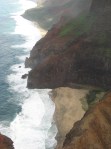 Perhaps the Waimea Canyon was the pinnacle of the helicopter tour, but there was more drama in store for Hubby and me. Changing direction again, Jimmy steered the ‘copter towards Mt. Wai’ale’ale, nearly as tall as Mt. Kawaikini. I readily admit a lot of anxiety as he made a direct bee-line for the mountain face, not even entertaining the idea of hovering upwards the closer we got. I felt that the sheer rock face was almost spitting distance away before he actually did a 180-degree pivot away from the summit, and headed back on towards the northern Napali Coast. (Yes, I did glance to check if the barf bags were still in place.)